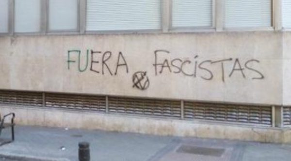 Los autores del ataque han decorado la fachada principal con una pintada en la que se puede leer "Fuera fascistas". Mensaje que han adornado con una esvástica nazi. A pocos metros de la pintada, el dispositivo de control de acceso ha quedado totalmente inutilizado tras haber sido rociado con pegamento.