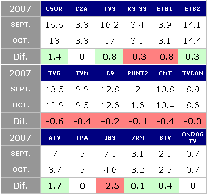 El conjunto de cadenas autonómicas permanece en la cuarta posición del ranking de cadenas a 1,6 puntos de la tercera opción, Antena 3. Récord de la aragonesa ATV (8,7%) y mínimo histórico para la madrileña Telemadrid (9,5%), la balear IB3 (4,6%) y la segunda catalana K3-33 (3,1%). A continuación detallamos en una tabla el resultado de cada cadena en octubre y el diferencial con respecto al mes anterior: