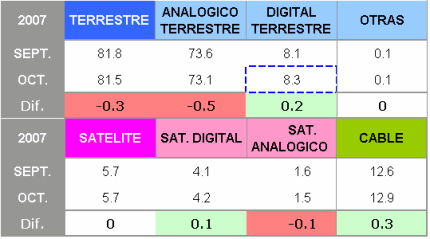 En cuanto a los diferentes sistemas de distribución, el soporte tradicional, Analógico Terrestre (73,1%) es el mayoritario aunque continúa descendiendo a favor de la 'TDT' (8,3%) y del 'Cable' (12,9%), mientras que el 'Satélite' (5,7%) mantiene el resultado de septiembre. A continuación detallamos los resultados en cada uno de los soportes de distribución y su diferencial con respecto al mes anterior: