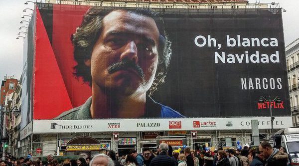 La polémica se desató hace unas semanas, cuando se hizo popular el mensaje que preside este cartel: "Oh, blanca Navidad", una felicitación navideña que en este caso hace una clarísima alusión a la cocaína, protagonista de la serie. Muchos han criticado que esta frase es una inmoralidad por relacionar a la Navidad con la droga; y otros, entre ellos el presidente de Colombia, Juan Manuel Santos, van incluso más lejos al considerar inconcebible que un asesino y narcotraficante como Pablo Escobar tenga un lugar tan preferente en el corazón de la capital española.