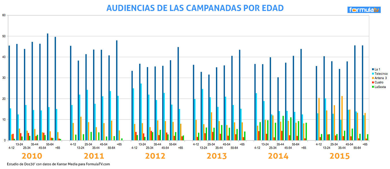 En gran parte, TVE le debe su hegemonía a los mayores de 55 años y, en concreto, de 65 años, único target que nunca ha bajado del 40% (pico mínimo: 43,4% en 2013). Como anécdota, cabe señalar la media de 45,5% registrada en 2015 en mayores de 55 años, la más alta desde 2011 y muy por encima del resto de edades, ante la propuesta más "desenfadada" de Antena 3 y Telecinco.
