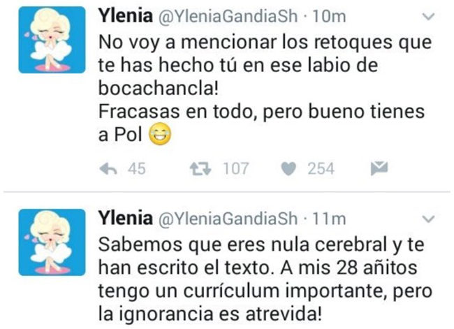 La de Benidorm desacredita las afirmaciones de Adara a través de su perfil de Twitter. "Sabemos que eres nula cerebral y te han escrito el texto. A mi 28 añitos tengo un curriculum importante, pero la ignorancia es atrevida. No voy a mencionar los retoques que te has hecho tú en ese labio de bocachancla. Fracasas en todo, pero bueno, tienes a Pol", denigra Ylenia a Adara.