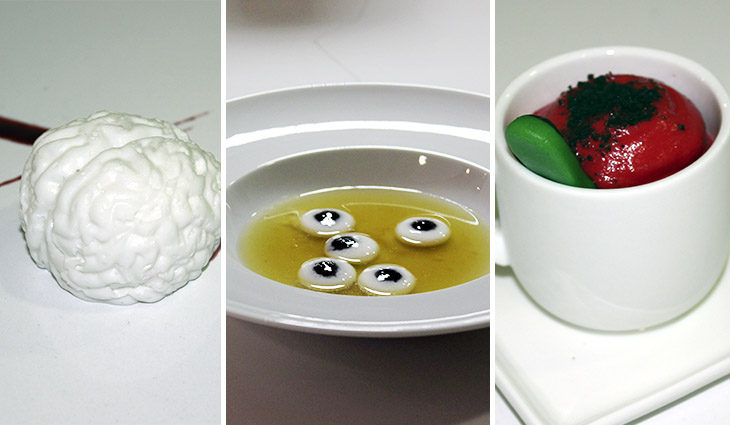 Lo cierto es que todo estuvo cuidado al detalle. Ramón Freixas comentaba que el menú no es fruto de un día y que la trama de la serie, más bien el comportamiento de su protagonista, inspiró cada ingrediente. En un showcooking muy particular desgranó todos los detalles de los platos, comenzando por un "consomé de amor a primera vista". Aquí daban el punto sangriento unos ojos, más bien esferificaciones, llenos de sabor (crema y tinta de calamar).