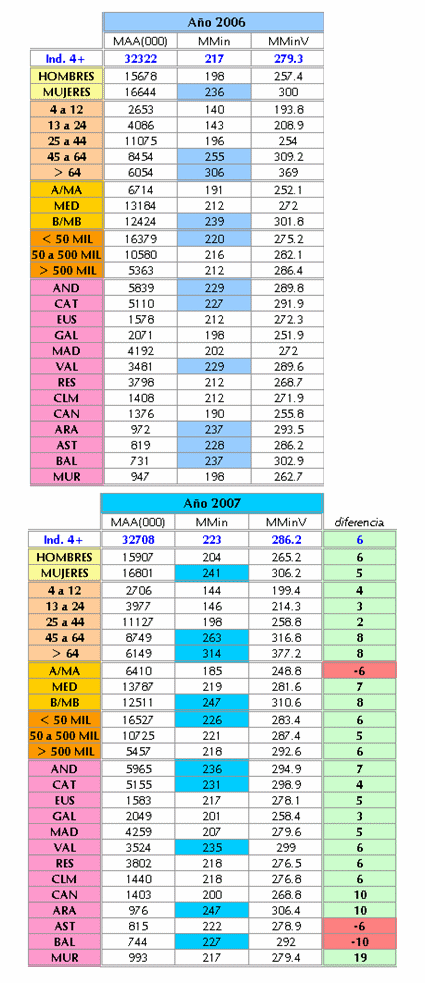 Al igual que en 2006, el análisis de periodos confirma al domingo como la jornada con mayor audiencia (243 minutos), y a enero como el mes más propenso para el visionado (243).