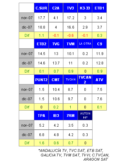 Desde el mes de marzo el grupo de televisiones Autonómicas no alcanzaba el 15,1% de cuota de pantalla. Todas las primeras autonómicas, a excepción de la catalana TV3 (16,6%) que desciende seis décimas, muestran plusvalías durante el mes de diciembre, siendo la andaluza CSUR (18,8%) la que consigue la cifra más alta en cuota de pantalla del total de autonómicas liderando además en su ámbito de emisión.