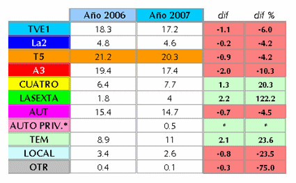 La recurrente fragmentación televisiva provoca que en 2007 todas las cadenas históricas pierdan cuota de pantalla a nivel nacional. En puntos de share, los mayores descensos con respecto a 2006 los registra Antena 3 (-2), seguida de TVE-1 (-1,1); porcentualmente, y al margen de la televisión no convencional, Antena 3 es la cadena más dañada (-10,3% de descenso con respecto a 2006).