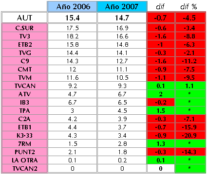 La FORTA registra su mínimo histórico anual. El 14,7% de share medio en el conjunto de los canales autonómicos durante el 2007 supone una pérdida de siete décimas con respecto al año anterior, observándose descensos en todas sus cadenas a excepción lógicamente de tres de las últimas incorporaciones: ATV (Aragón), TPA (Asturias) y 7RM (Murcia).