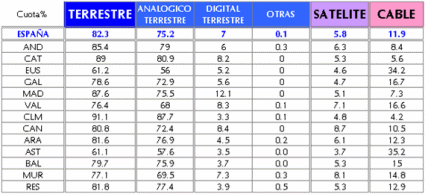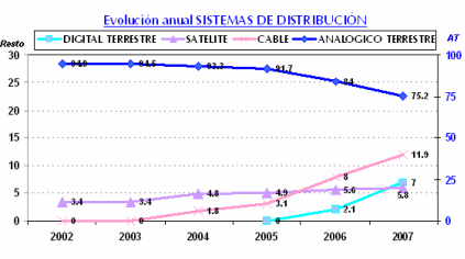 De cada 100 minutos consumidos de televisión en España durante 2007, 82,3 fueron a través del sistema terrestre (de los que 75,2 pertenecen al sistema analógico terrestre y 7 al digital terrestre), 5,8 vía Satélite, y 11,9 a través de el Cable. Con respecto al año 2006, la TDT experimenta un incremento de 4,9 puntos (+233%), también el Cable muestra un importante ascenso de 3,9 puntos (+49%) durante el 2007 y el Satélite aumenta ligeramente en 0,2 puntos (+4%). En contraposición, el sistema analógico terrestre, aunque continúa siendo el mayoritario, experimenta una merma de 8,8 puntos (-10%).