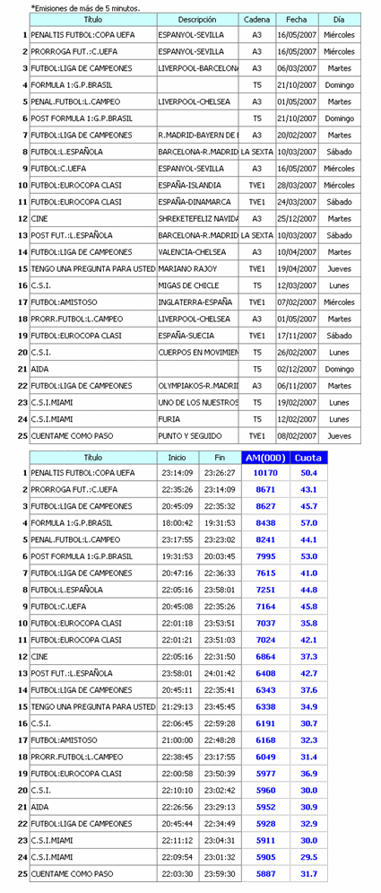 Siguiendo la tendencia de años anteriores, el ránking de las emisiones más vistas del 2007 está copado por acontecimientos deportivos. De esta manera, la retrasmisión de los penaltis del partido de Copa UEFA entre Espanyol-Sevilla congregó a 10,170,000 espectadores con una cuota de pantalla del 50,4% convirtiéndose en la lo más visto del año.