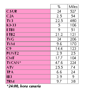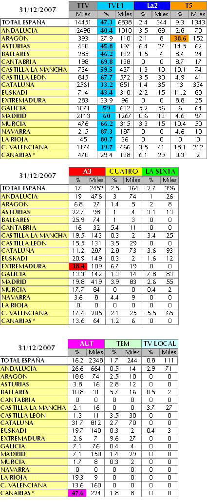La1 lidera en el total de España a excepción de en las regiones de Aragón (donde lideró Telecinco ya que su retrasmisión fue desde Zaragoza), en Extremadura (donde se impuso Antena3) y en Canarias (donde la opción mayoritaria fue su autonómica TVCAN).