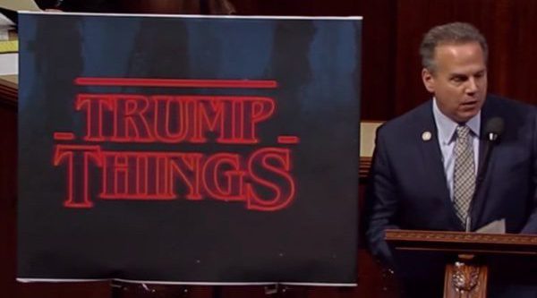 Cicilline, que es un fan confeso de las aventuras de Eleven y compañía, se presentó en el mismísimo Congreso estadounidense con una enorme pancarta en la que se podía leer "Trump Things" con la tipografía de la popular serie.