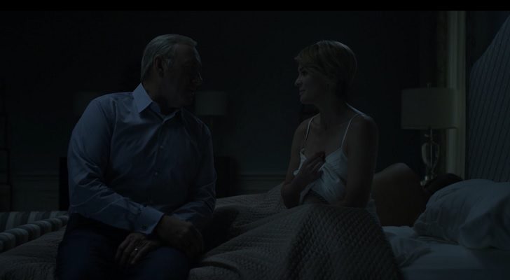 "Chapter 55" ha estado repleto de detalles. Desde Doug inscribiendo, a modo de despedida, sus iniciales en el cajón de la mesa del despacho oval hasta la gloriosa escena de los Underwood diciendo las frases de los personajes de 'Perdición' del gran Billy Wilder. Antes de esto habíamos presenciado otro gran momento: Frank y Claire conversando sobre Tom, mientras éste permanecía dormido, como un bebé, en la cama que últimamente comparte con la primera dama.