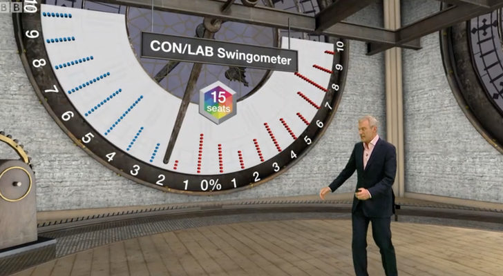 A pesar de la recreación digital de la Cámara de los Comunes, la estrella de la noche fue, una vez más, el "swingometer". Este medidor, que se usa desde el año 1955 en la televisión británica, sirve para calcular cómo varían los votos y qué porcentaje gana o pierde, según el punto de vista, cada partido en cada demarcación.