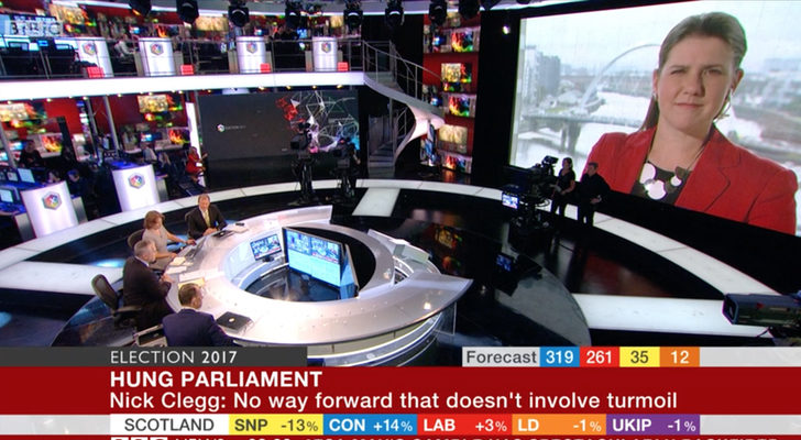 La cobertura de la cadena pública británica analizó, escaño a escaño, los resultados electorales a medida que el escrutinio iba avanzando. Ayudados de una pantalla de gran tamaño, además del "swingometer" y de la evolución de voto se mostraban estadísticas relativas al apoyo a la Unión Europea, entre otras, dada la relevancia que ha alcanzado el Brexit en estos comicios. Sin duda, una serie de datos que ayudan a comprender los resultados y a desgranarlos en su contexto.