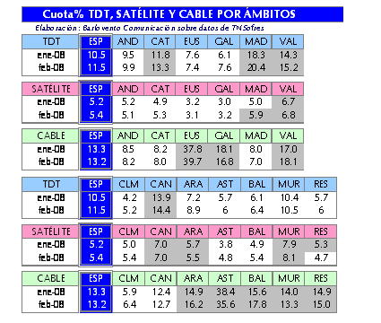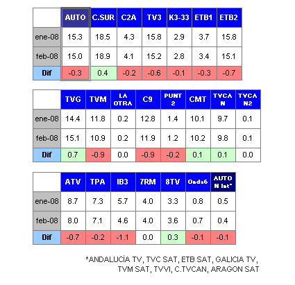La mayoría de las cadenas presentan ligeras pérdidas con respecto al mes anterior, si bien es preciso indicar que Canal Sur, en Andalucía, registra el 18,9 % que es su mejor resultado desde febrero 2006 y se mantiene como cadena líder en su ámbito de cobertura, siendo además la emisora más vista de las que componen la F.O.R.T.A., y TVG en Galicia, que obtiene su mejor índice (15,1%) desde mayo 2007.