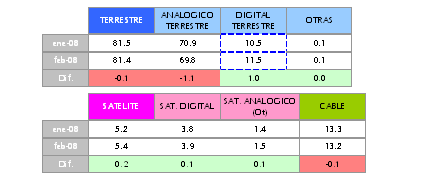 La Televisión Digital Terrestre vuelve a crecer un punto en febrero hasta alcanzar el 11,5% del total de sistemas de distribución. Madrid, Valencia, Canarias y Cataluña son de nuevo los ámbitos donde la TDT tiene una mayor representación. Por su parte, el 5,4% del tiempo que se ve la televisión se hace a través del Satélite y el 13,2% restante a través del Cable.