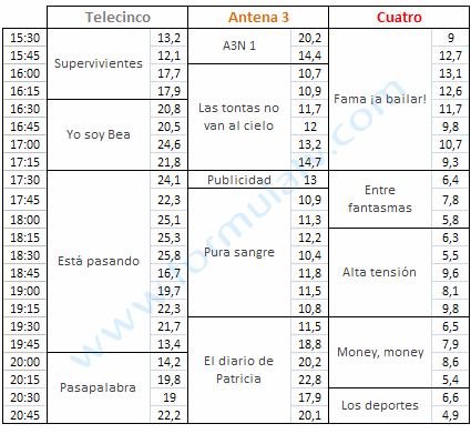 Como se puede apreciar en el cuadro, 'Las tontas no van al cielo' arranca con un 10,7% pero presenta una clara trayectoria ascendente a lo largo de toda su emisión pese a competir contra Bea. De esta forma, la novela acaba con un 14,7% y gana 4 puntos a lo largo de su emisión. En Cuatro, todo lo contrario sucede con 'Fama ¡a bailar!', que consigue buenos datos al principio pero va bajando a lo largo de la emisión. El reality de Cuatro cosechó este lunes uno de sus peores datos de las últimas semanas.
