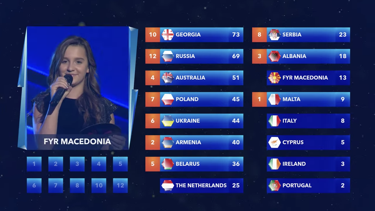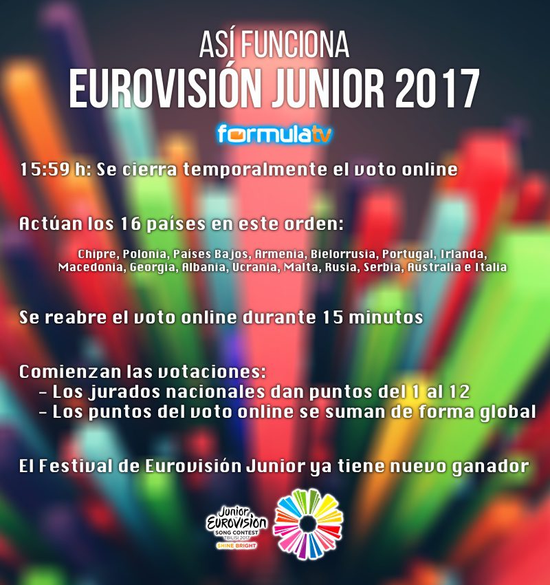 Chipre, Polonia, Países Bajos, Armenia, Bielorrusia, Portugal, Irlanda, Macedonia, Georgia, Albania, Ucrania, Malta, Rusia, Serbia, Australia e Italia, por este orden, tratarán de sumarse a la codiciada lista de vencedores de Eurovisión Junior, que en 2017 estrena sistema de votación. Además de los votos, del 1 al 12, de cada jurado nacional, una cantidad se puntos equivalente se repartirá porcentualmente en función de los votos del público, que por primera vez llevan votando desde el viernes a través de la página web.