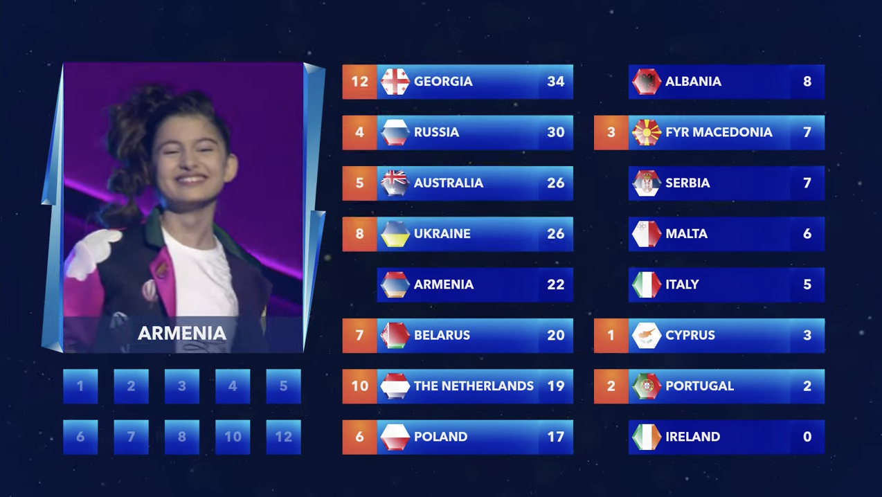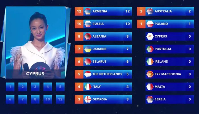Comienzan los votos del jurado. Los 12 puntos de Chipre son para Armenia