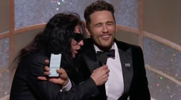 Una vez en el escenario y tras su abrazo con Franco, Tommy Wiseau intentó decir unas palabras pero el actor rápidamente le apartó del micrófono, levantando así la risa de todos los asistentes. Franco siguió con su larga lista de agradecimientos en la que incluía a su hermano Dave Franco, a quien le dedicó unas emotivas palabras: "Te quiero más que a nada".