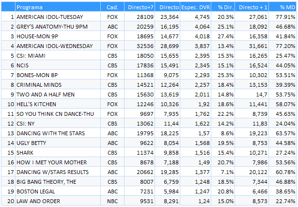 En el caso de 'American Idol', el 77% de la audiencia que graba el concurso lo ve el mismo día, casi inmediatamente a su emisión en directo. Este porcentaje baja hasta el 46% o 41% en el caso de 'Grey' o 'House', pero sigue siendo muy elevado.