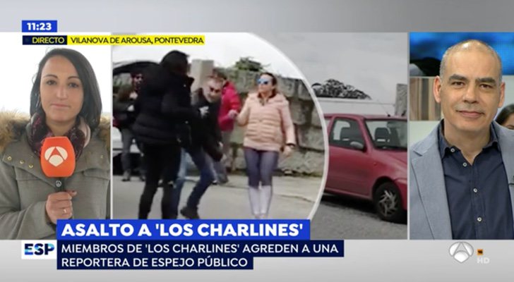 El programa matinal de Susanna Griso ha viajado hasta Pontevedra para conocer de primera mano la agresión que han sufrido dos de los miembros de 'Los Charlines'. Cuando la reportera se acercó a realizar preguntas al clan, uno de ellos agarró con fuerza el teléfono móvil y el micrófono de la periodista y lo rompió contra el suelo. Frases como 'sois unos sinvergüenzas' y agarrones e intentos de agresión se ven en el vídeo que ha mostrado 'Espejo Público'.