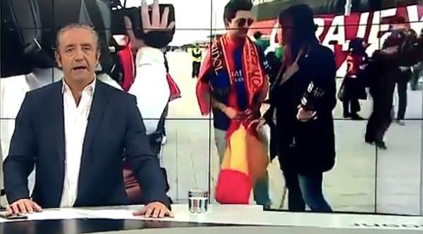 En las imágenes podemos ver cómo el culé se la pone en la espalda pero ella insististe en que "no me la vas a ensañar. ¡Que se me cae el pelo!". Tras escuchar algo por el pinganillo, la periodista le pide que la deje encima de una mochila que tiene en el suelo pero él quiere dejársela a su padre, que está a su lado en la conexión. Finalmente ella consigue su objetivo y la coloca en un lugar que evita que pueda ser vista en cámara. "Cabrearse por una bandera es tontería (...) Parece que el Barça es de Catalunya solo", sentencia en ese momento el seguidor del club.