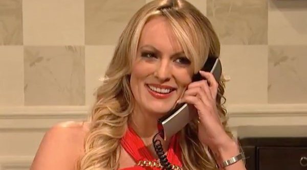 La parte del programa en la que ambos salen hablando muestra primero a Donald Trump y su abogado Michael Cohen, interpretado por Ben Stiller. El presidente le pide llamar a Stormy Danields para solucionar el lío en el que se encuentra, que es aclamada por aplausos cuando aparece en pantalla. Una vez los tres están conectados Trump le dice: "¿Qué llevas puesto?" y acto seguido echa a su abogado de la llamada.