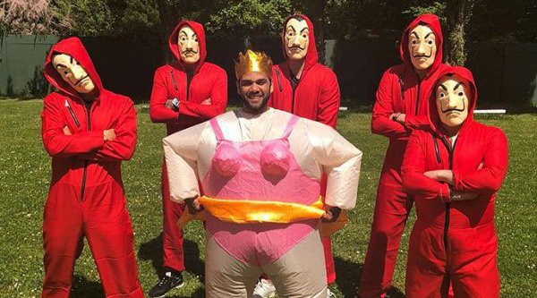 Cualquier ocasión parece buena para rendir homenaje a la serie de moda, solo hace falta ver que las famosas máscaras de Dalí de la ficción se han convertido ya en todo un icono. Los amigos de Dani Alves han querido aprovechar el tirón internacional de los atracadores disfrazándose como ellos. Vestido de princesa gigante, el brasieño se ha confesado como un fan de la serie que protagoniza Ursula Corberó.