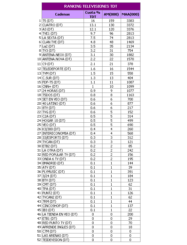 La apuesta por la TDT de Telecinco sigue sin levantar el vuelo, con una bajada de Telecinco 2, que se compensa con la insólita décima que consigue el canal de teletienda del grupo.