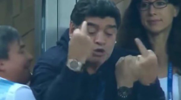 Las cámaras captaron a Maradona celebrando el gol de Leo Messi, donde se mostró al borde del éxtasis y agradeciendo a Dios el primer tanto de los argentinos. Con el gol de Marcos Rojo, se pudo ver cómo el director técnico comenzó a perder los papeles, a mostrar gestos inapropiados y dedicando peinetas a los aficionados de Nigeria. Sin embargo, el espectáculo de Maradona no quedó ahí.