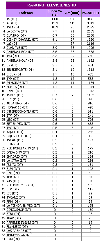 Madrid encabeza el carro de la TDT con un notable 23,7%, seguido de Valencia (22,5%) y Catalunya (23,7%).