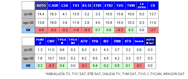 Las televisiones autonómicas son las otras grandes perjudicadas, junto con Telecinco, por la influencia de los JJ.OO. al registrar uno de sus peores datos mensuales tras junio de 1994 (13,5%) y junio de 2008 (13,7%). A pesar de ello, la asturiana TPA (8,5%) alcanza su máximo histórico. Por el contrario, la catalana TV3 (11,9%) firma su mínimo mensual.