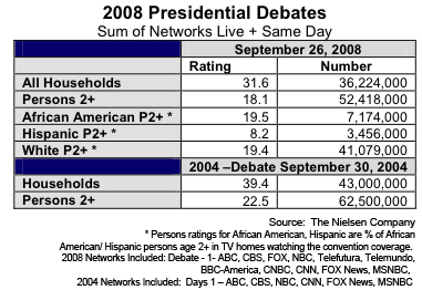 Tras obtener los datos de las 11 cadenas (ABC, CBS, FOX, NBC, Telefutura, Telemundo, BBC-America, CNBC, CNN, FOX News Channel, y MSNBC fueron las cadenas que emitieron el debate en directo desde las 21h hasta las 22:45h aproximadamente), el debate entre los candiatos a la Presidencia de los Estados Unidos, John McCain y Barak Obama, congregó a más de 52 millones de espectadores y un 18,1 de rating, según Nielsen Wire.