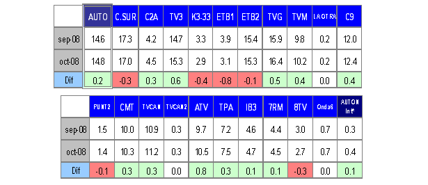 La Televisión Digital Terrestre mantiene su crecimiento sostenido y suma en octubre casi un punto hasta alcanzar un nuevo record mensual. Por su parte, el sistema convencional Analógico, el Satélite y el Cable decrecen en comparación con el mes pasado.