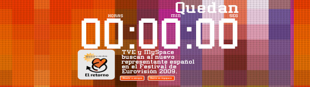 TVE y MySpace buscan al nuevo representante de TVE en el Festival de Eurovisión a través de un sistema mixto, compuesto por la decisión de los internautas y la de un jurado experto. Desde este lunes, 24 de noviembre, y hasta el 17 de diciembre, los aspirantes pueden presentar sus candidaturas en la página de MySpace (www.myspace.com/eurovision2009).
