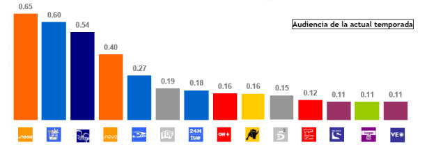 En este nuevo contexto, Neox sigue liderando la oferta de la TDT de la temporada al marcar un 0,65% de cuota de pantalla por delante de la segunda opción, Clan TVE (0,60%) y ser además la cadena que más crece (0,33%) junto a Clan TVE. Nova por su parte se consolida en la cuarta opción con un 0,40%.