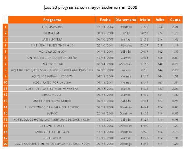 En lo que llevamos de año 2008, Neox también es líder (0,55%) frente a Clan TVE (0,51%), con Nova en tercera posición (0,33%).