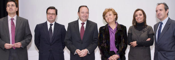 La directora del Instituto Cervantes, Carmen Caffarel; el presidente de la Corporación RTVE, Luis Fernández; el subdirector general de SM, Javier Palop; el director de Investigación y Desarrollo de BBVA, Manuel Castro, y el presidente del Gobierno de La Rioja, Pedro Sanz Alonso, presentaron hoy en la sede del Instituto Cervantes este curso, dirigido a todos aquellos interesados en conocer la lengua española en cualquier lugar del mundo.