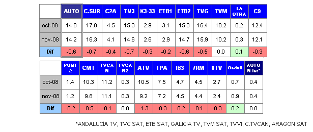 El conjunto de televisiones autonómicas frenan el crecimiento que venían experimentando en los últimos meses y decrecen seis décimas en noviembre con pérdidas en todos los targets, principalmente entre los niños de 4 a 12 años. Canal Sur sigue siendo la autonómica con cuota más alta.