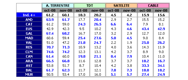 La TDT muestra en el mes de noviembre el mayor incremento mensual con un aumento de 1,9 puntos distanciándose en cerca de cinco puntos con el "Cable" (15,6%) que desciende ligeramente al igual que el "Satélite" (4,2%) y el "Analógico Terrestre" (60,1%).