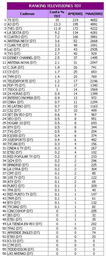 El Grupo RTVE sigue siendo el más visto aunque baja, mientras que Antena 3 sube y se queda a poco más de un punto de distancia. El grupo Telecinco baja debido al desplome de su canal principal, aunque Telecinco 2 y FDF suben ligeramente.