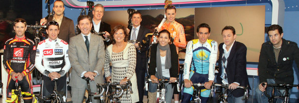 Televisión Española ha presentado este miércoles, 17 de diciembre, la 64ª edición de la Vuelta Ciclista a España en un acto en Torrespaña que ha transmitido en directo La 2 y RTVE.es. Carlos de Andrés, la voz del ciclismo en TVE, ha conducido el programa que ha servido para desvelar los detalles de las 21 etapas y conocer de primera mano lo que piensan sobre el recorrido los cuatro grandes triunfadores de este año y candidatos a ganar la Vuelta 2009: Alberto Contador, Carlos Sastre, Samuel Sánchez y Alejandro Valverde. Antes, los corredores han compartido pelotón y pedaladas con el equipo de TVE, formado por Lorenzo Milá, Ana Blanco, Perico Delgado, María Escario, Jesús Álvarez, Sergio Sauca, Lourdes García Campos y Juan Carlos Rivero. Además han participado Jaime Lissavetzky, secretario de Estado para el Deporte; Javier Guillén, director de Unipublic y de la Vuelta; y Julián Reyes, director de Deportes de TVE.