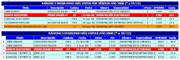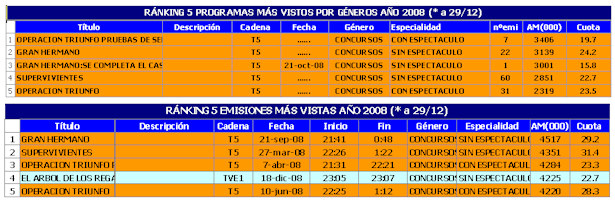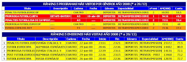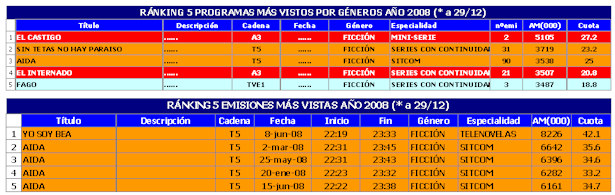 En el desglose por los diferentes géneros, el ránking de programas (promedio por títulos) y emisiones más vistas en el 2008 son: