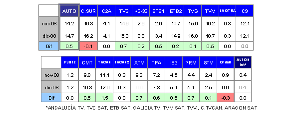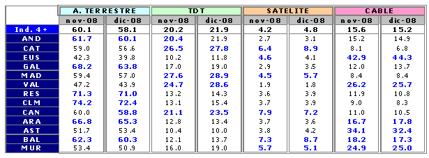 En el mes de diciembre el único sistema de distribución que presenta crecimiento es el "satélite" con el 4,8% de cuota, mientras que el "analógico terrestre" (58,1%), que sigue siendo el mayoritario, decrece dos puntos, también la TDT (21,9%) desciende tres décimas y el "cable" (15,2%) cuatro décimas.