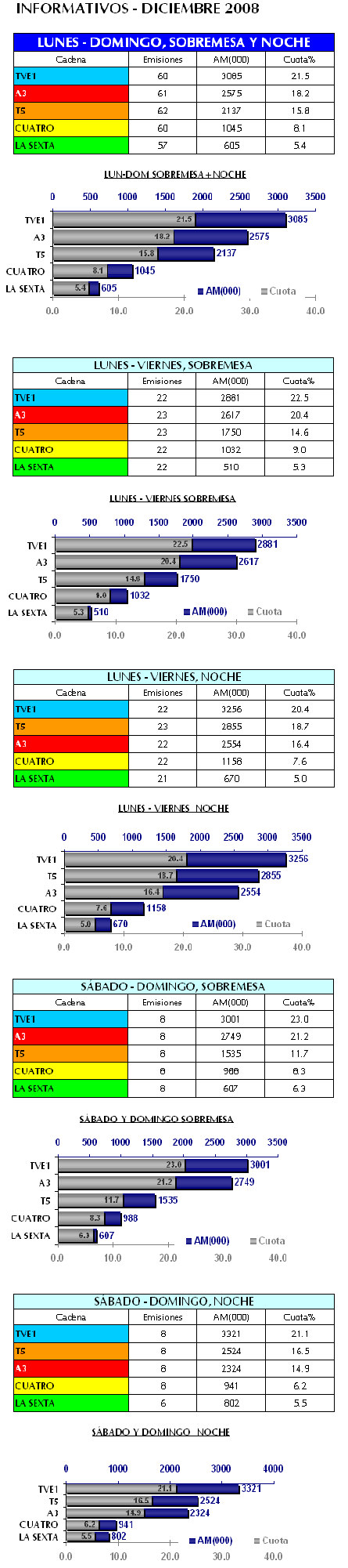 Ofrecemos a continuación el detalle de los informativos en función de las franjas y las distintas cadenas.