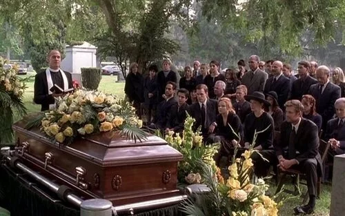 La muerte de él en el piloto, convirtiéndose en su propio cliente en la empresa que fundó, es la primera de muchas otras. A partir de entonces, cada episodio arranca con una muerte, siendo algunas cómicas, otras más trágicas y otras más sorprendentes, pero todas ellas ayudarán a que los protagonistas se planteen cosas y que evolucionen, algo que no deja de ocurrir con el paso de las temporadas. Otro aspecto importante del estilo que nos plantean es el fundido a blanco tras la muerte de cada capítulo, alejándose del clásico negro para este recurso, y distanciándose también de la relación entre el negro y la muerte. De hecho, es sobre estos fondos blancos, cuando aparece el nombre, el año de nacimiento y el de la muerte de cada uno, siendo esta imagen algo muy representativo de esta ficción. Y hablando del estilo que nos presenta el piloto, no podemos olvidarnos de esas píldoras a modo de anuncios con cierta comedia que se nos intercala durante el episodio interrumpiendo las dramáticas tramas de los Fisher. Sin conocerse el motivo ni dar ninguna explicación (que tampoco hacía falta), este aspecto desapareció a partir del segundo capítulo.