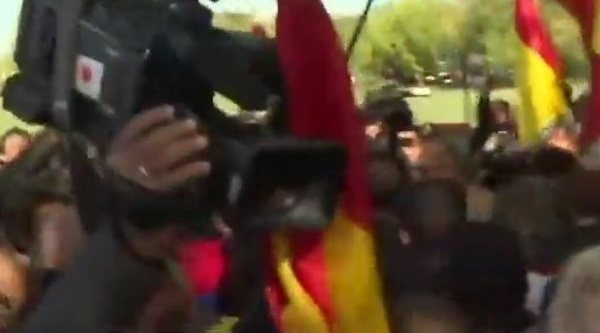 Algunos de los manifestantes han zarandeado las cámaras y han pegado manotazos a los periodistas al grito de "gentuza" y "periodistas, terroristas". Olmos se ha mantenido detrás de su cámara pidiendo a los más violentos que dejaran de empujar y repitiendo que estaban "trabajando". Ha sido entonces cuando la periodista ha recibido dos puñetazos, tras lo que ha alertado a las autoridades presentes: "Policía, nos están pegando".