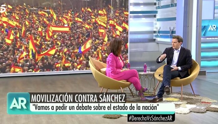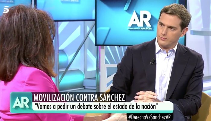 Ana Rosa preguntó a Rivera cuáles serían los pasos a seguir por Ciudadanos tras la manifestación. El catalán respondió con un relevante anuncio: "Hoy vamos a registrar una petición para que haya un debate del Estado de la Nación ya" con el objetivo de "frenar a Pedro Sánchez". "España lleva cuatro años sin debatir sobre el Estado de la nación y la nación no está en su mejor momento. Me parece que si este gobierno pedía el debate estando la oposición, Sánchez tiene que convocarlo junto a la mesa del Congreso".