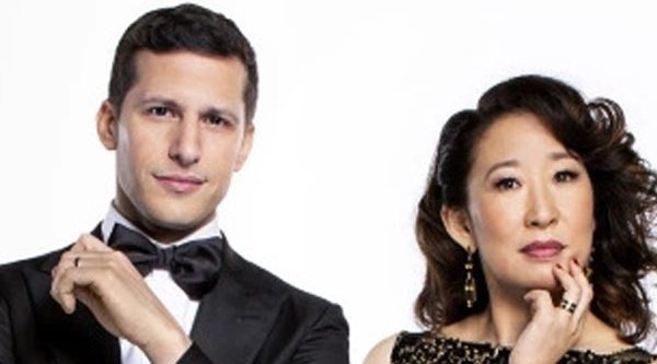 Seth Meyers no repetirá como maestro de ceremonias y cede su puesto a dos reconocidos actores: Andy Samberg y Sandra Oh. Ambos posan juntos en una primera sesión de fotos unas semanas antes de una de las grandes noches para el cine y la televisión junto a un renovado trofeo que cambia ligeramente de aspecto. Para Samberg será la cuarta tez que se ponga al frente de una gala así, ya que antes encabezó los MTV Movie Awards de 2009, la edición 28 de los Independent Spirit Awards y los Premios Primetime Emmy en 2015.
